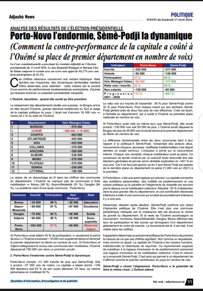 La Cour constitutionnelle a proclamé les résultats définitifs de l’élection présidentielle du 12 avril 2026. Le duo Romuald WADAGNI et Mariam Chabi-Talata remporte le scrutin avec un score sans appel de 94,27% avec une forte participation de 63.5%.Ces chiffres nationaux consacrent une victoire historique. Mais derrière ces moyennes, des dynamiques territoriales méritent d’être observées avec attention : cette victoire est le produit d’une somme de performances localescertaines exemplaires, d’autres qui laissent entrevoir un potentiel considérable inexploité.L’Ouémé, deuxième , quand elle aurait pu être premièreLe classement des départements révèle une surprise : le Borgou arrive en tête devant l’Ouémé, grenier électoral traditionnel du Sud et siège de la capitale politique du pays. L’écart est d’environ 18 000 voix moins de 2 % du total de l’Ouémé.