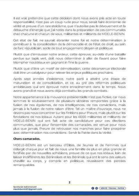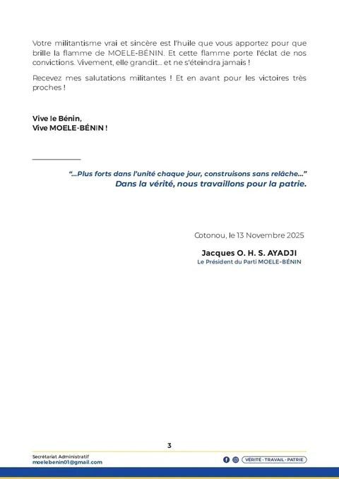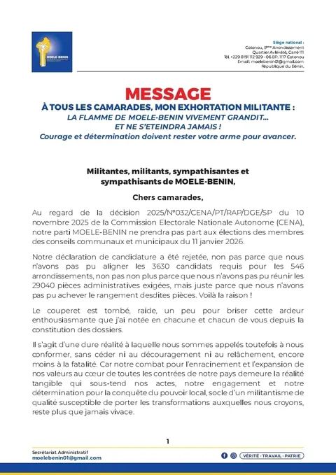 Dans une lettre militante datée du 13 novembre 2025, le président Jacques O. H. S. AYADJI appelle ses camarades à la résistance et à la détermination face au rejet de leur candidature aux élections communales et municipales de janvier 2026.Refusant de céder au découragement après la décision de la Commission Électorale Nationale Autonome (CENA), le parti MOELE-BENIN dénonce ce qu’il considère comme une injustice tout en réaffirmant son engagement indéfectible pour la conquête du pouvoir local. « La flamme de MOELE-BENIN vivement grandit… et ne s’éteindra jamais! », martèle le président dans ce message de trois pages adressé aux militantes, militants et sympathisants.Qualifiant cette décision de « déconvenue électorale » et de « catalyseur pour relever les enjeux politiques prochains », Jacques O. H. S. AYADJI exhorte ses troupes à transformer cette épreuve en force, soulignant que leur combat pour les valeurs républicaines et l’engagement citoyen reste plus vivant que jamais. Le parti se positionne ainsi comme un acteur incontournable du paysage politique béninois, déterminé à faire triompher ses convictions lors des prochaines échéances électorales.