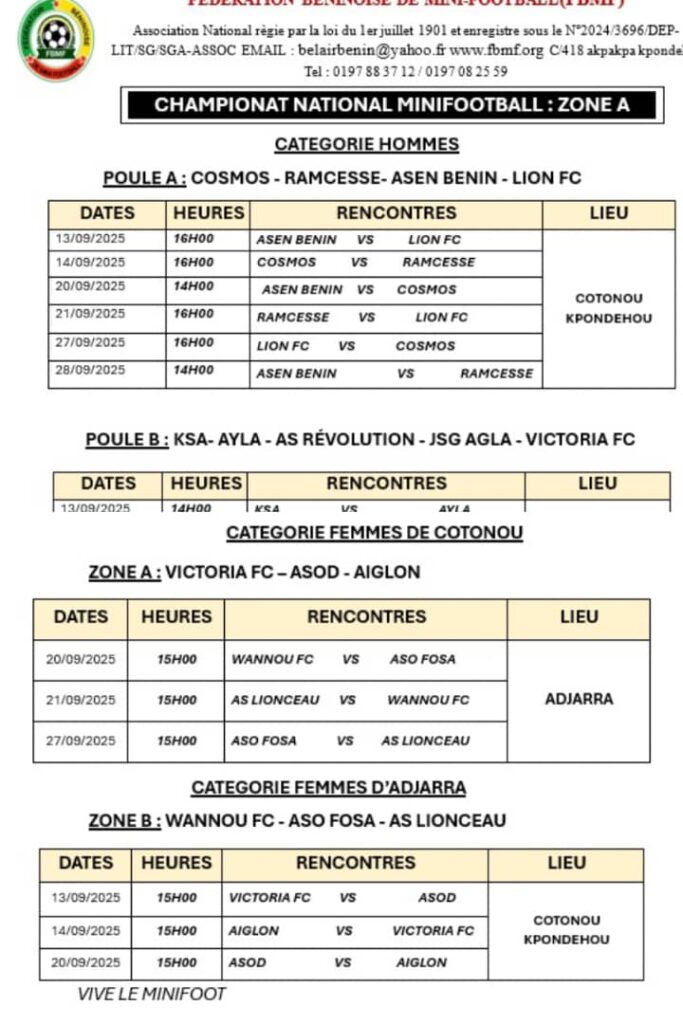Les samedi 20 prochain, on aura trois autres rencontres. Dans la catégorie homme, on aura:ASEN BENIN # COSMOS à 14: heures et AS Révolution # KSA à 16 heures. Dans la catégorie féminine, ASOD affrontera Aiglon à 15 heures. Le dimanche prochain, dans la catégorie AYLA joue contre JSG Agla à 14:heures et Ramcesse# Lions FC à 16 heures. Sur le terrain municipal de Adjarra, dans la catégorie féminine, Wannou FC joue ASO FOSA le samedi et le dimanche, AS Lionceaux défie Wannou FC. Les deux matchs sont pour 15 heures.