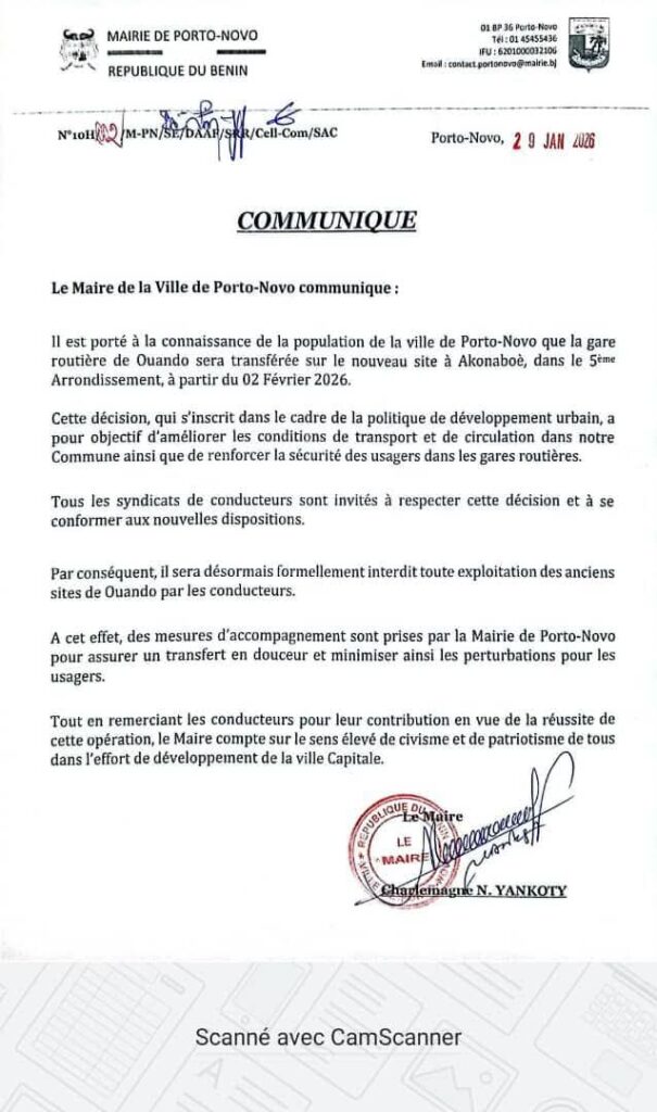 La ville de Porto-Novo, capitale du Bénin, s’apprête à franchir une étape importante dans l’organisation de ses transports. Le Maire, Charlemagne N. YANKOTY, a en effet publié un communiqué officiel, daté du 29 janvier 2026, annonçant le transfert de la gare routière de Ouando vers un nouveau site à Akonaboè, dans le 5ème Arrondissement.Le changement prend effet dès ce lundi 2 février 2026.