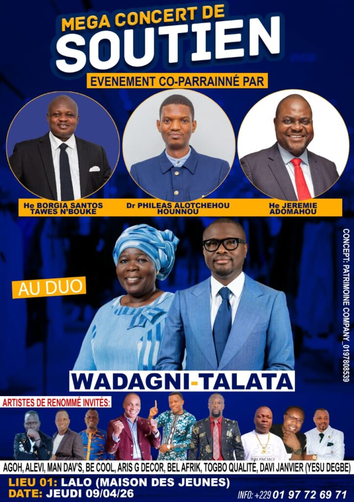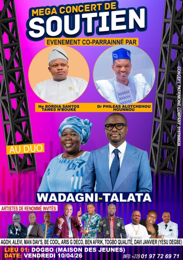 Le lendemain, vendredi 10 avril 2026, c’est la Maison des Jeunes de Dogbo qui accueillera à son tour le mega concert. Cet événement est co-parrainé par He Borgia Santos Tawes N’BOUKE et Dr Philéas Alotchehou HOUNNOU, deux personnalités qui s’engagent ainsi sur les deux communes, signe d’une mobilisation coordonnée et déterminée.