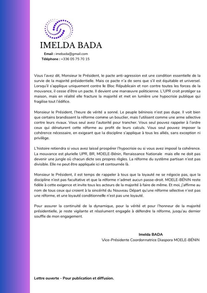 Imelda BADA interpelle directement le président TALON, l’exhortant à agir pour rétablir la cohérence et la discipline au sein de la majorité. «C’est une trahison de votre vision, Monsieur le Président, et une insulte à l’intelligence du peuple béninois », lance-t-elle, estimant que les incohérences actuelles « affaiblissent la crédibilité collective et installent la suspicion permanente dans la majorité ».La responsable conclut sa lettre en réaffirmant sa détermination à défendre la réforme du système partisan « jusqu’au dernier souffle » de son engagement, pour « la vérité et l’honneur de la majorité présidentielle ».