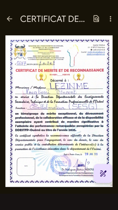 Le certificat délivré par la DDESTFP-Ouémé symbolise la reconnaissance officielle de la Direction Départementale pour l’engagement, le sens du devoir, le sens du service public et la contribution déterminante de Vincent LEZINME à l’atteinte des performances remarquables enregistrées par la structure au cours de l’année 2025.Le bureau de la DDESTFP a souligné le mérite exceptionnel, la collaboration efficace et la disponibilité exemplaire dont a fait preuve Monsieur LEZINME, qualités qui ont contribué de manière significative à la promotion de l’excellence éducative dans le département de l’Ouémé.